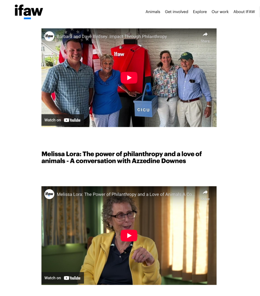 At Shoreline Media Productions, we know that with so many non-profit organizations doing incredible work for people, animals, and the environment, it can often be difficult to decide where to focus your donor strategies. We were excited at the opportunity to assist IFAW (The International Fund for Animal Welfare) in highlighting their vital mission through the eyes of supporters that prioritize animal welfare in their philanthropic giving and legacy planning to inspire like minded potential donors.